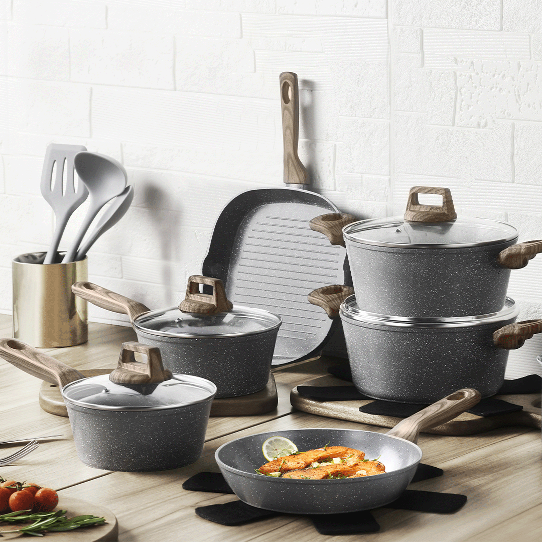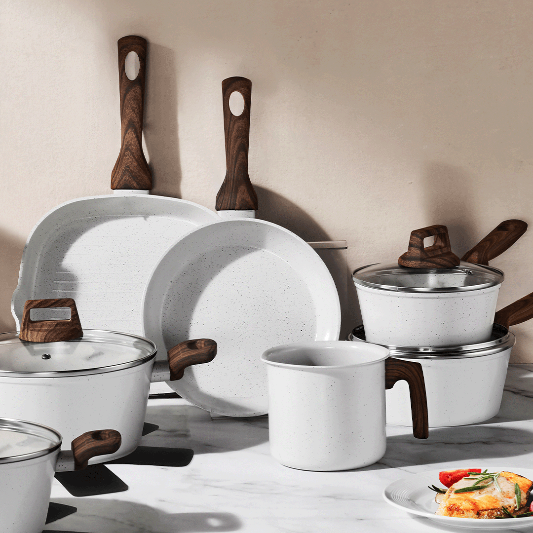 As panelas de alumínio riscam fácil, perdem antiaderência rápido e deformam com o uso. Já as panelas Bravatti têm revestimento Neo Ceramic, aquecimento uniforme e acabamento muito mais resistente.